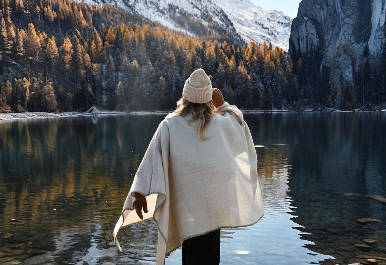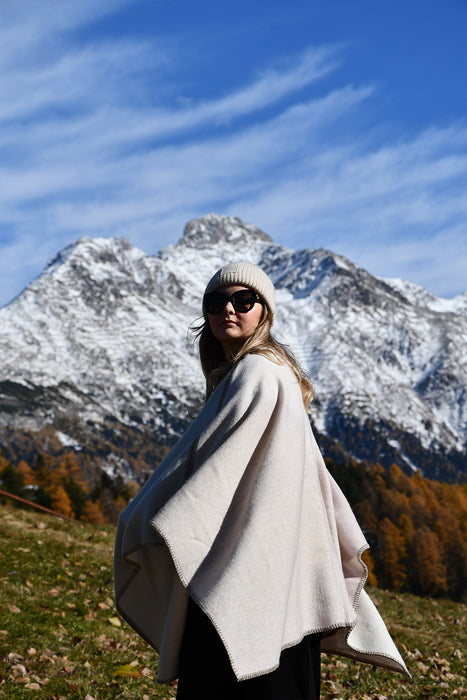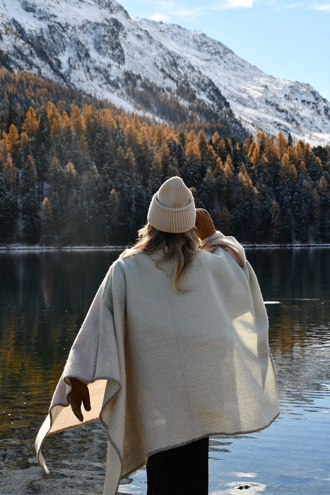 Dieser in Europa aus 100 % Merinowolle gewebte Poncho bietet natürliche Weichheit, Wärme und Atmungsaktivität. Das Strickmaterial fällt fließend und fühlt sich angenehm auf der Haut an – ideal für jede Jahreszeit. Er ist maschinenwaschbar im Schonwaschgang für Wolle und kann chemisch gereinigt werden, was für langanhaltende Qualität und einfache Pflege sorgt.