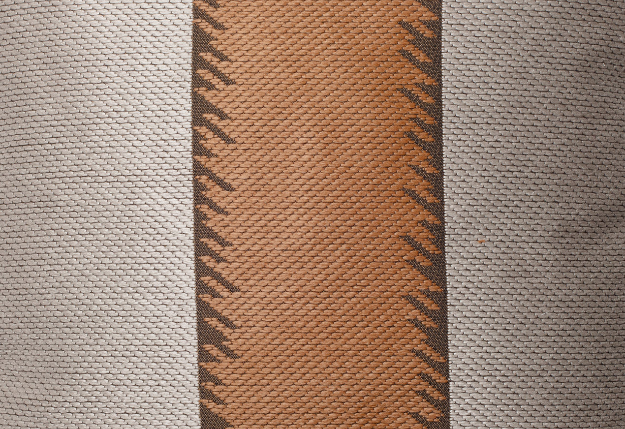One Love transforms rhythm and melody into a tactile experience through its oversized, graphic stripes. The slightly unconventional pattern echoes a playful yet structured composition, layering taupe and bronze tones that animate the fabric’s surface with depth and vibrancy. Designed to harmonise with plain textures, it balances boldness with restraint.