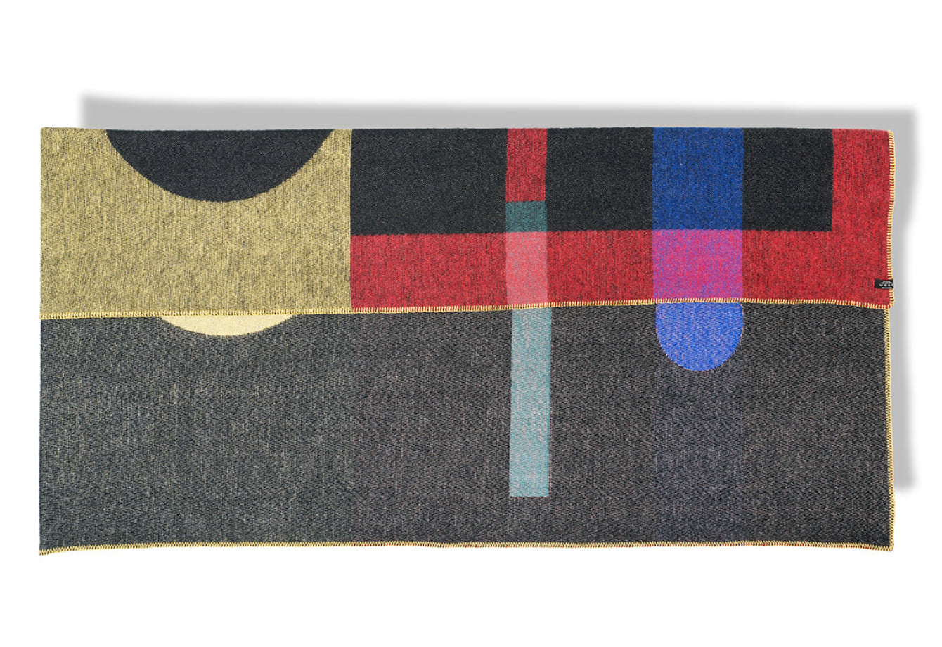 While paging through 1920s Bauhaus colour studies, Michele Rondelli wondered how their daytime bravado would read beneath low Alpine moonlight. Bauhaused answers with restrained hues: a parchment circle becomes a moon, a blue dot its echo; a scarlet rectangle stands like a silent façade, bisected by a muted green lintel. Negative space—an inky wool ground—gives each form room to breathe, so balance feels achieved rather than imposed. Fold the blanket and new narratives appear: eclipse, sundial, falling block. A simple grammar of shapes turns into an endless poem of alignment and drift.