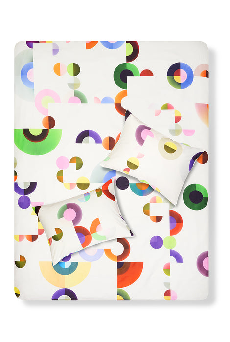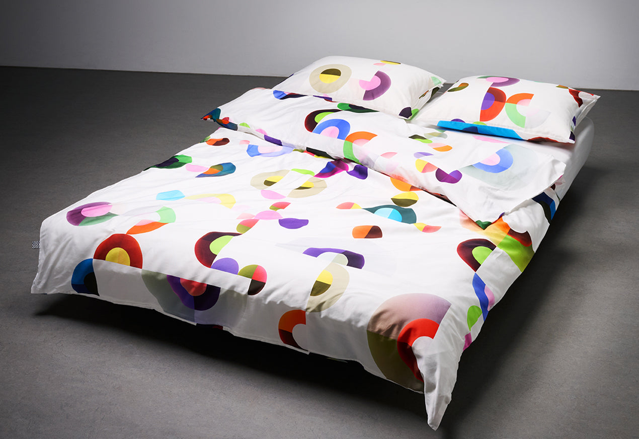 In Rondello, Christoffer Jørgensen celebrates the expressive potential of geometry. Interlocking circles and semicircles spread across the surface in a lively interplay of bold hues and soft gradients. The composition balances chance with structure, echoing classical geometric principles while embracing playful disorder. The result is energetic yet refined - a modern art-inspired bedding design that transforms the bed into a dynamic canvas.