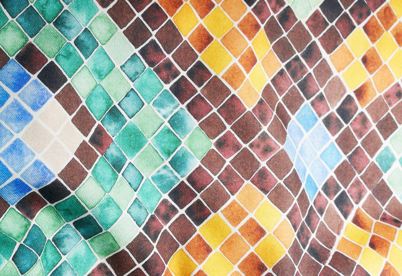 Crafted from 100% Panama-woven cotton, sourced from Europe, the "Tilescapes" shower curtain offers both beauty and durability. The yarns are woven to create a luxurious, heavyweight fabric, treated with Teflon EcoElite™ finish for added protection against water and stains. Designed to last, these curtains are hand-finished in Italy, featuring stainless steel eyelets for easy hanging. Machine washable and dry-cleanable, this curtain provides both practicality and artistic flair.