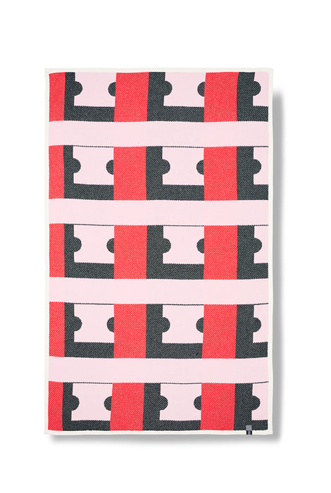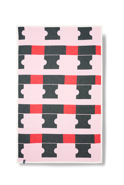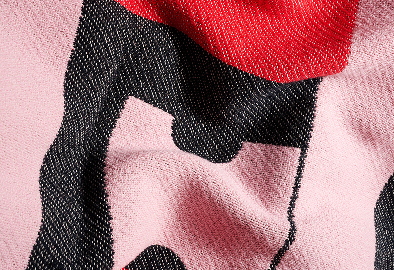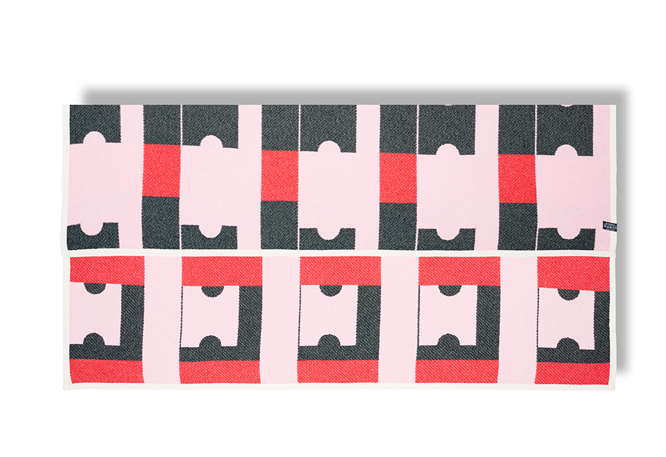 The Milano blanket explores balance through repeating blocks of color — black, red, and soft pink arranged in precise rhythm. Its interlocking forms create a visual puzzle, where each line and shape flows into the next. The design is graphic yet playful, making a bold statement in any interior.