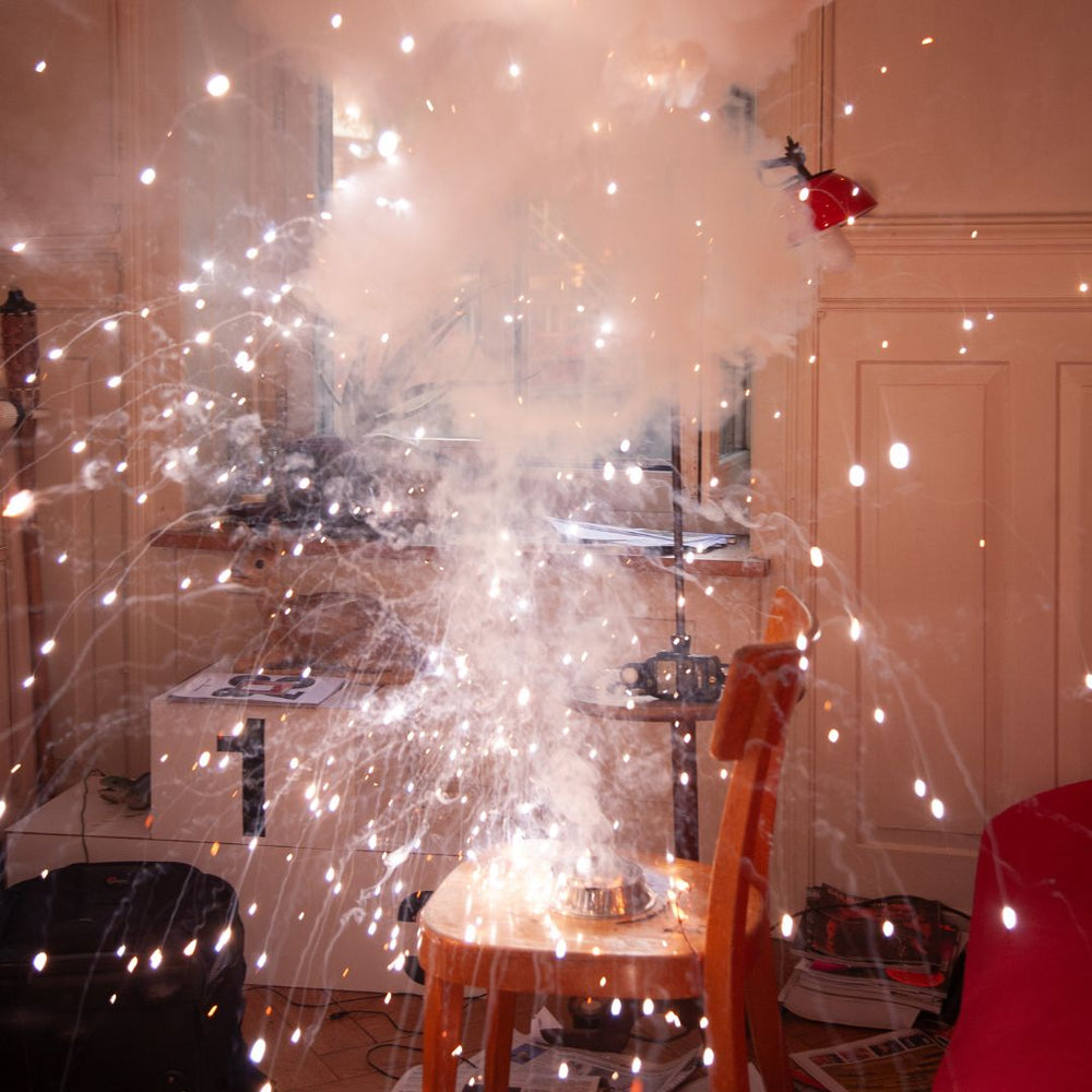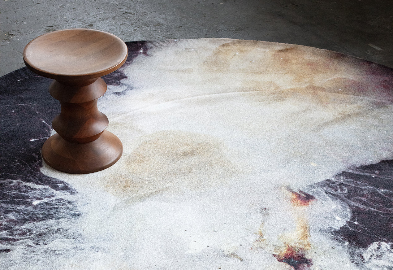 Inspired by ignited flash powder, the work evokes outer space - where destruction becomes serenity. Explosion lets you step directly onto the universe, turning the infinite into a tactile, intimate experience.