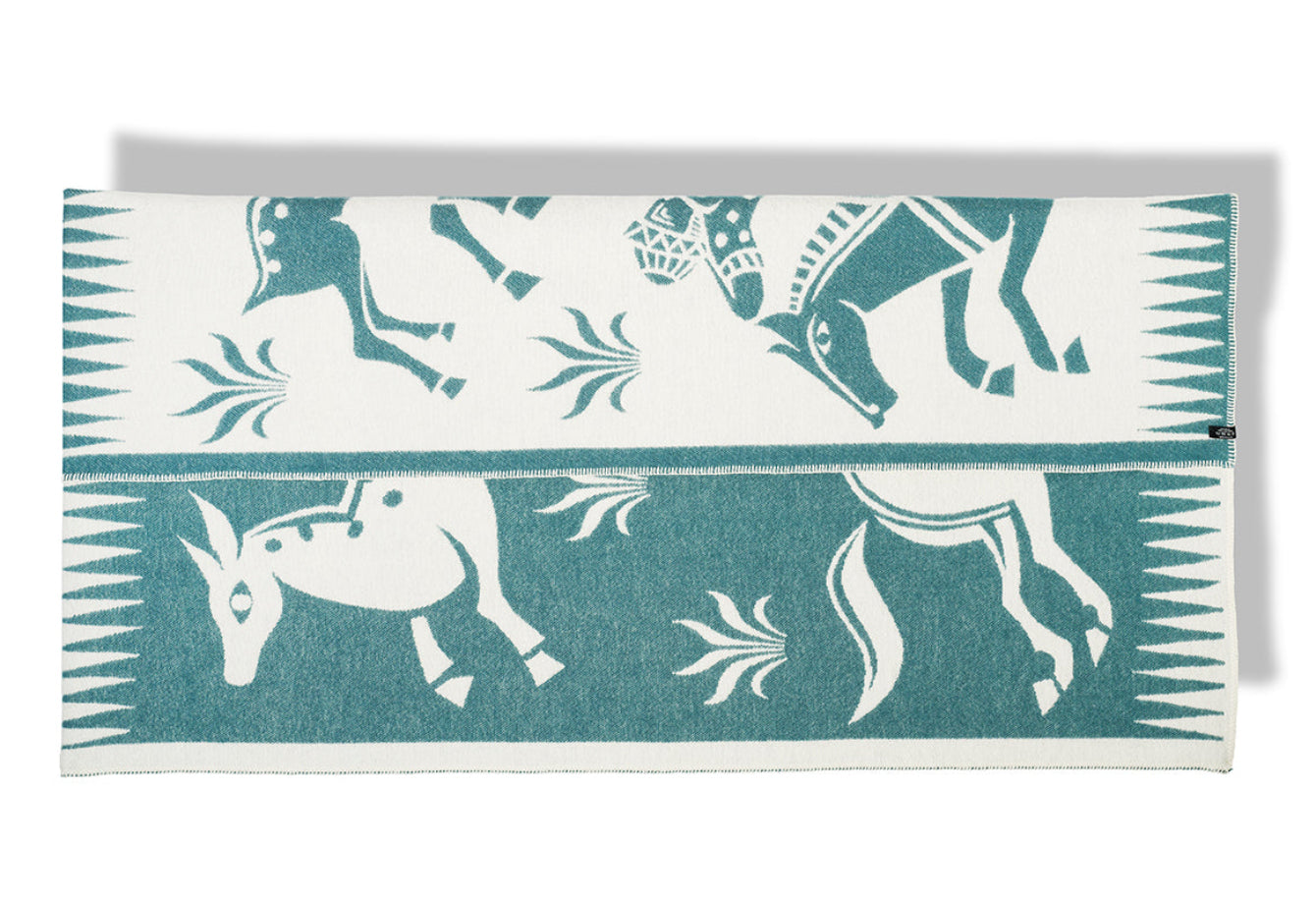 Greaves sifted through illustrated hunting albums commissioned by Mughal emperors—palm-sized gems dense with storytelling—and redrew their tension of speed and elegance. Enlarged here, negative space becomes breathing room between leaps, letting the eye glide from prancing deer to poised archer. The turquoise ground references jade tiles of Agra’s palaces, while lattice armour nods to court textiles. Fold the blanket and the narrative dissolves into bold abstraction, allowing it to shift between historic tableau and modern graphic accent with a single drape.