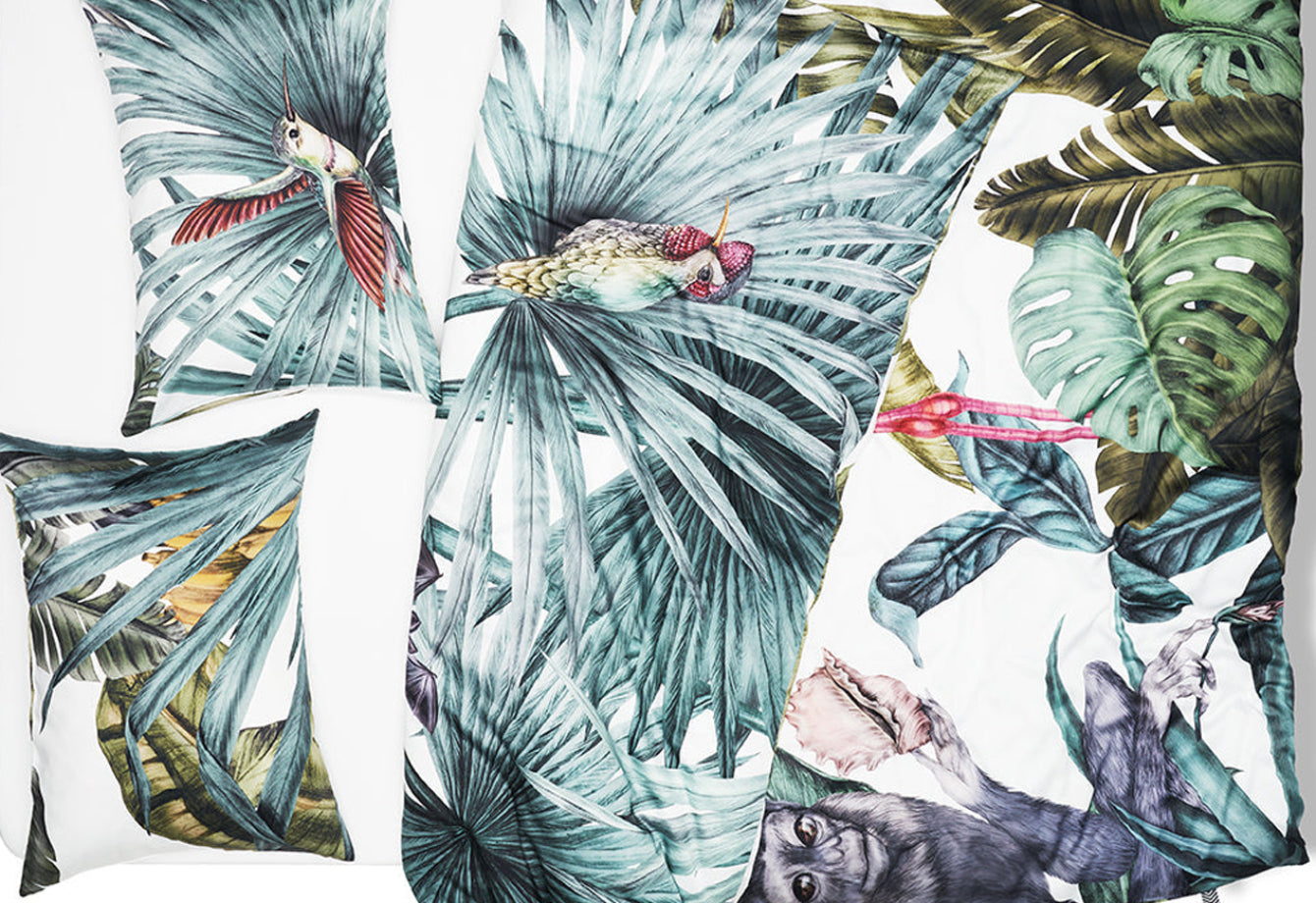 A joyful jungle dream; Monkey Business by Karina Eibatova brings a lively botanical world into your bedroom. Each piece is unique; filled with movement; playfulness; and connection to the natural world.