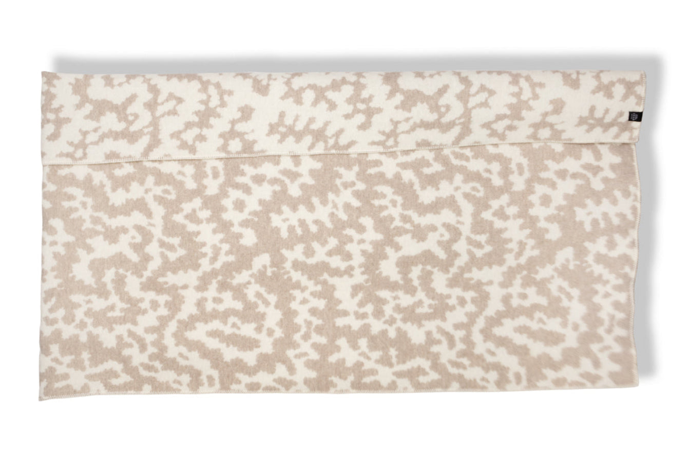 Tan brush-marks meander across an ivory ground like wind-shaped sand or migrating herds seen from the sky. The subtle, all-over pattern calms the eye while the jacquard weave of pure New Zealand wool delivers feather-light warmth—perfect for sofa, bed or veranda afternoons.