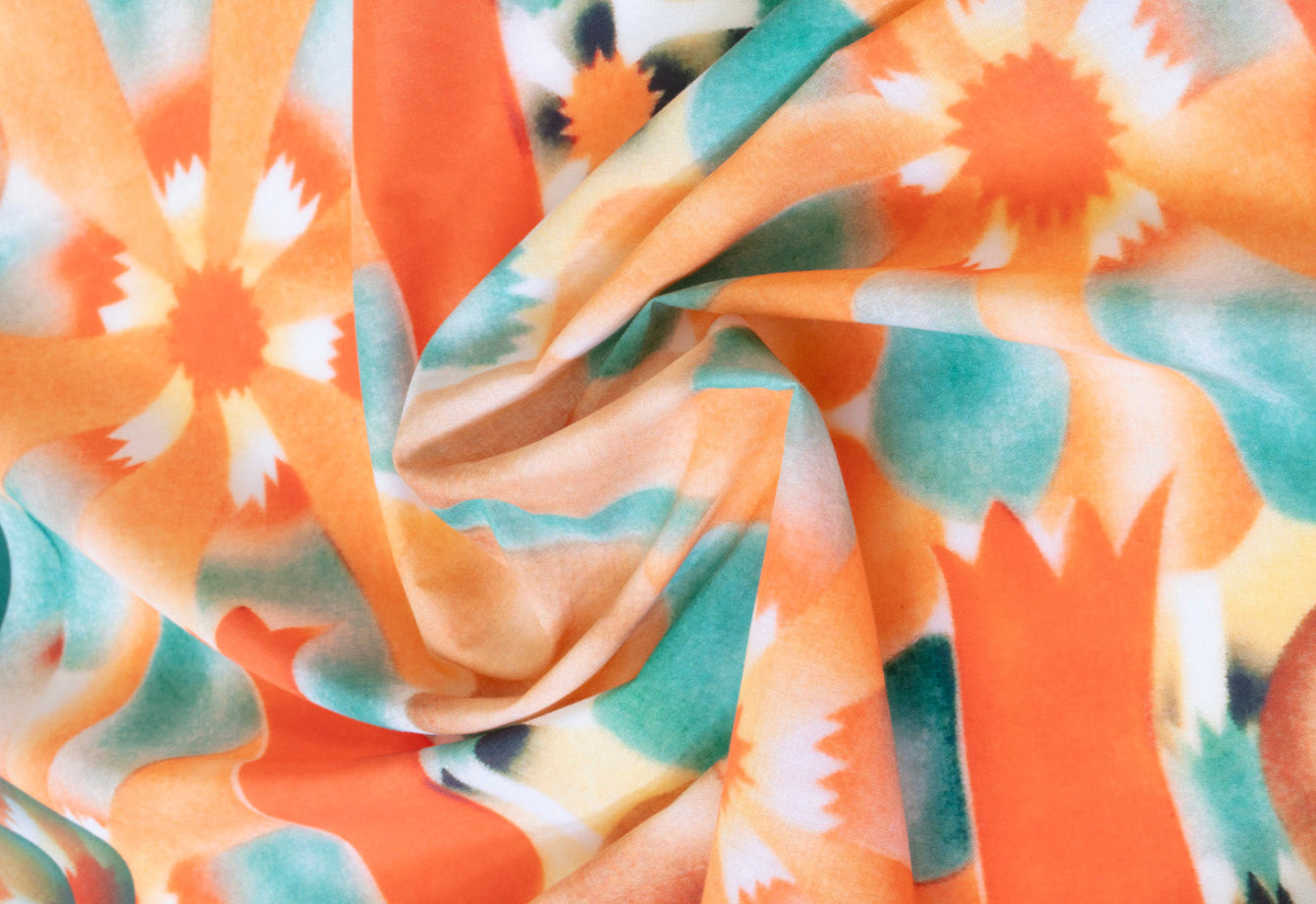 Made from 100% Global Organic Textile Standard (GOTS)–certified organic cotton, digitally printed for crisp architectural detail and luminous colour.