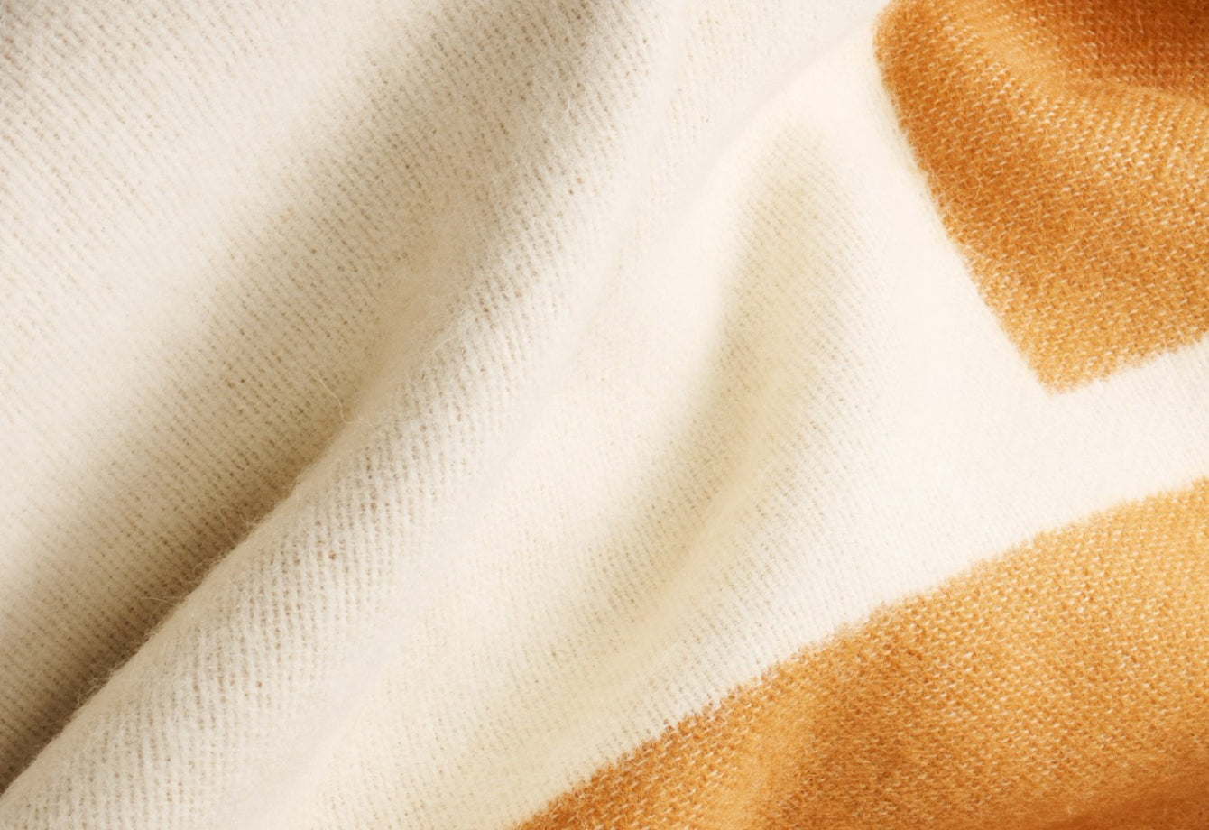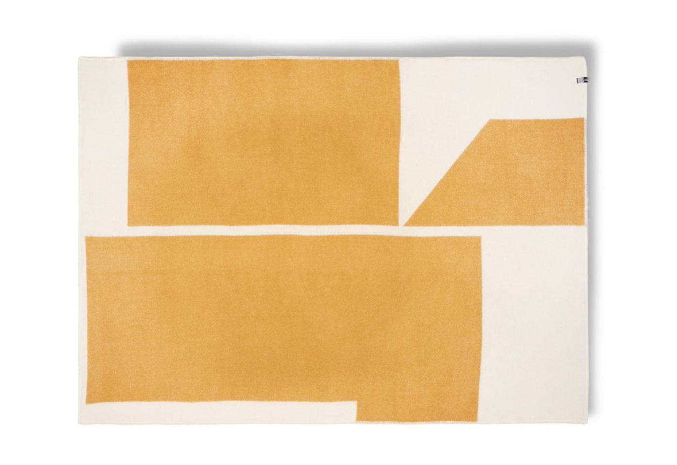 “Cut-Up Orange” by Ulla Pederson reimagines minimalism with bold, hard-edged shapes and vibrant orange contrasts. A striking wool blanket that merges art with comfort.