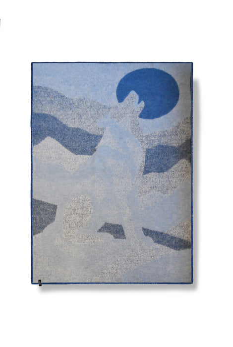 Inspired by ancient tales and the eternal symbolism of the wolf, this blanket evokes a world shaped by instinct and silence. Shades of blue unfold like mountains at dusk, while the wolf rises from the landscape in layered contours, caught in a moment between shadow and moonlight.