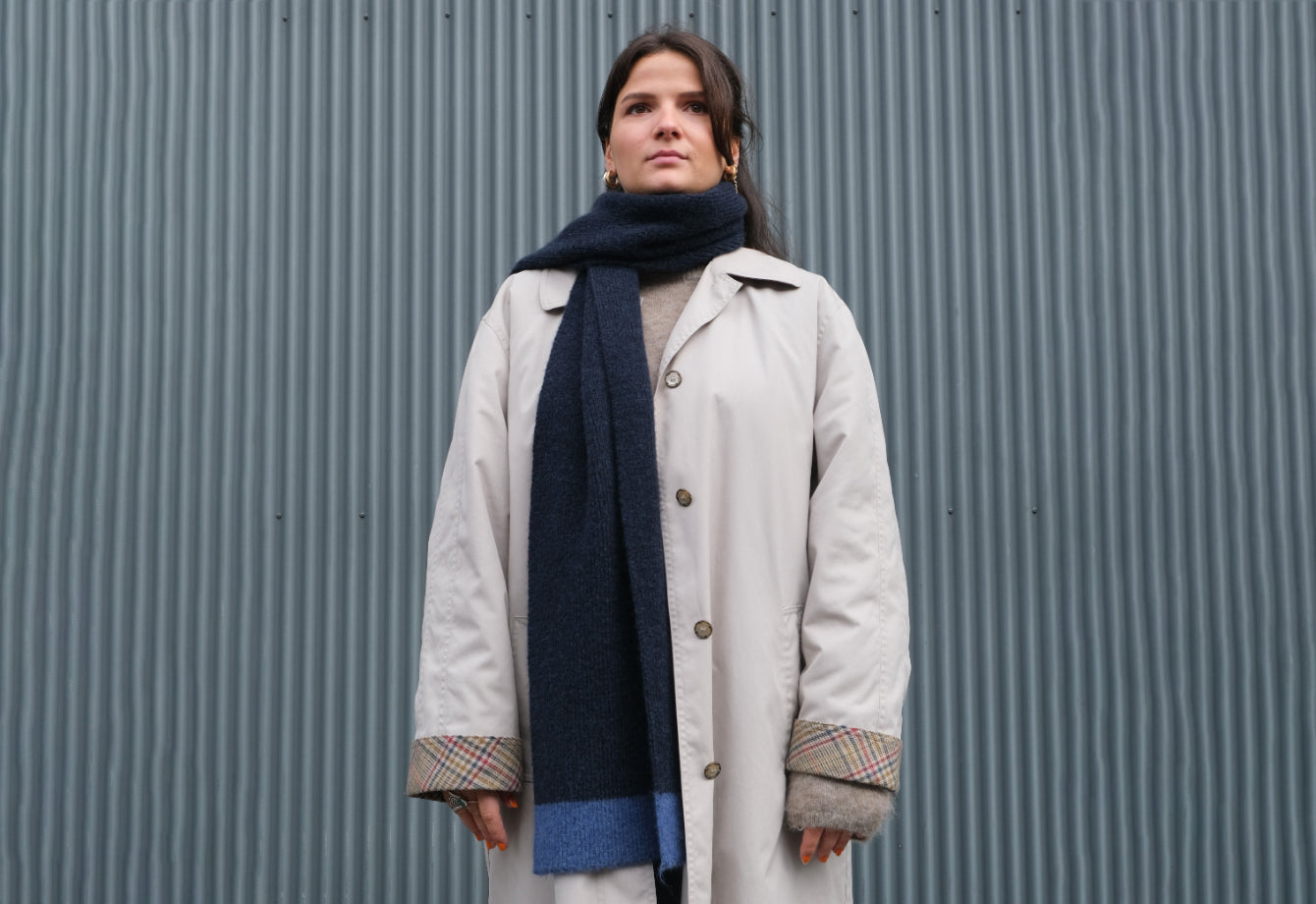 Conçue par Blanca Frei, l'écharpe en laine d'alpaga "Trio Colore" - Bleu encadre un champ de minuit profond avec deux notes lumineuses - le bleu pétrole et des taches de couleur rappelant les agrumes sur le bord de la toile. La côte compacte crée du volume sans encombrement, et s'adapte parfaitement, qu'elle soit bouclée une seule fois ou superposée. Une étude tranquille des contrastes et des proportions, qui donne un accent pictural à la tenue d'hiver tout en restant raffinée et sans effort.