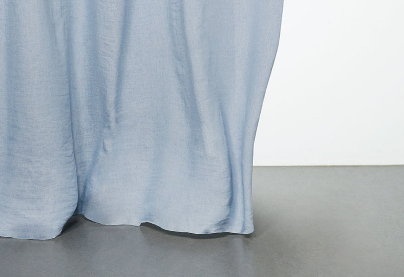 Ce rideau révèle une trame nuancée où deux tons fusionnent par des fils fil-teints, créant un dégradé doux enrichi par la finition stonewash. La structure de poids moyen équilibre translucidité et présence, laissant filtrer la lumière naturelle avec une délicate teinte bleue qui anime chaque espace.