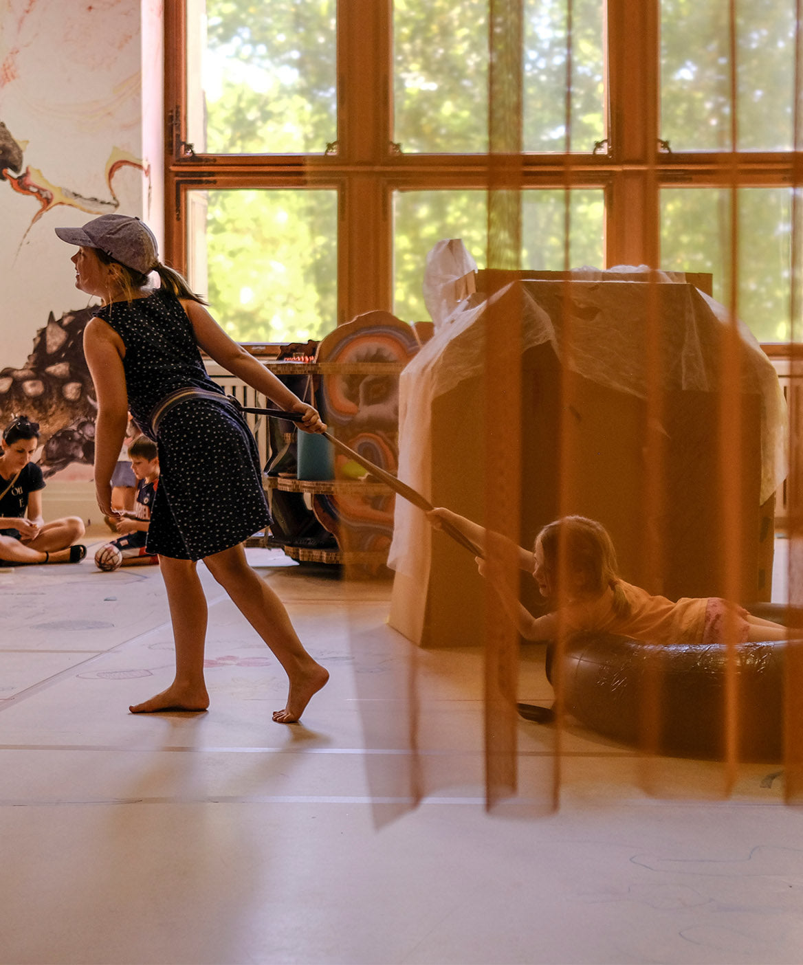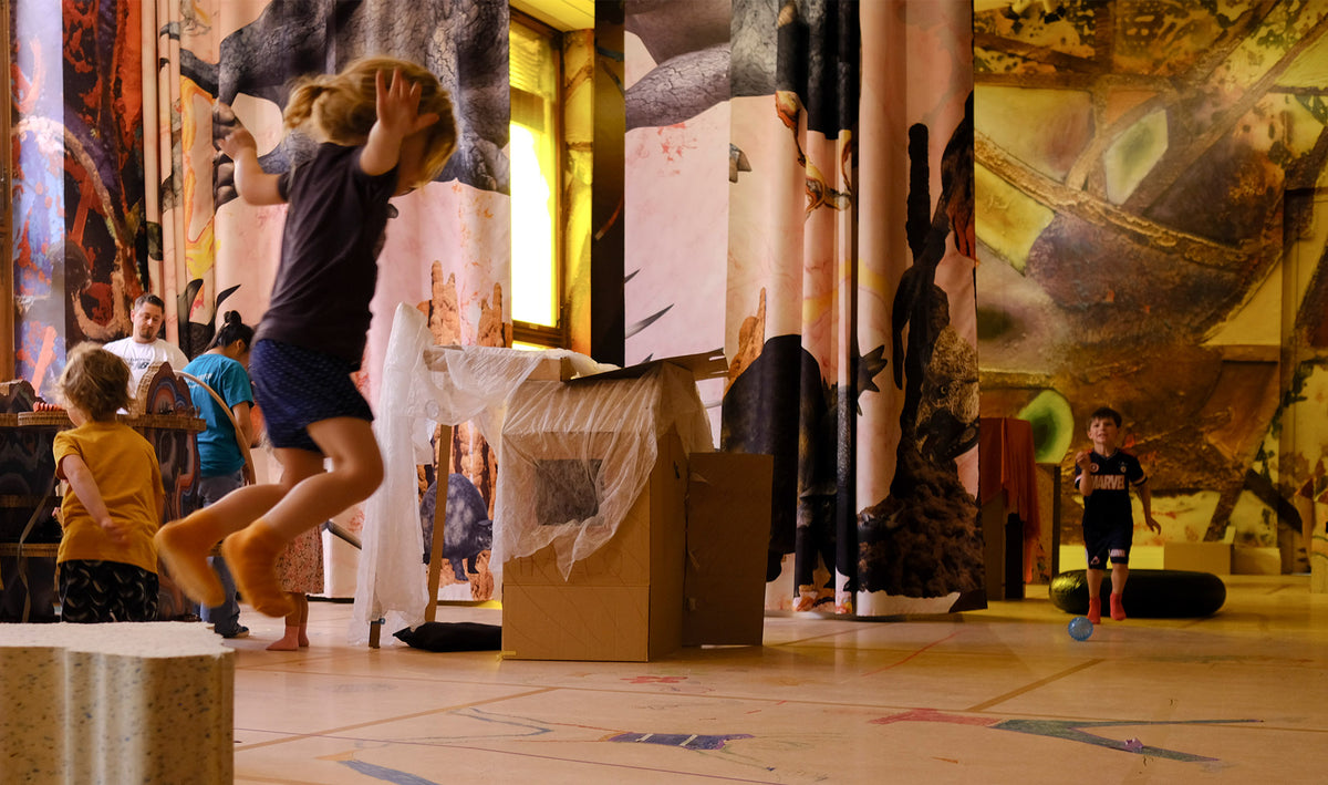 Pour BAUBAU, l'espace de jeux pour enfants du Gropius Bau, Kerstin Brätsch a métamorphosé le lieu en un univers fantastique où l'imagination est reine. La pièce invite les visiteurs de tous âges à renouer avec leur curiosité enfantine et ludique. Des représentations colorées de dinosaures, de créatures mythiques et de pierres précieuses marbrées animent l'espace, créant une atmosphère immersive et joyeuse.