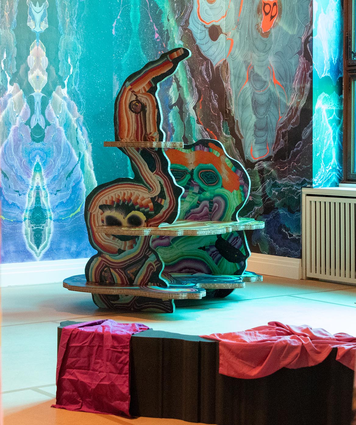 Élément central du projet : un tapis sinueux de grande taille, imprimé sur mesure avec les compositions exclusives de Brätsch. Se déployant dans l’espace, il structure visuellement la pièce tout en offrant une expérience tactile qui invite au mouvement, au jeu et à l’exploration.