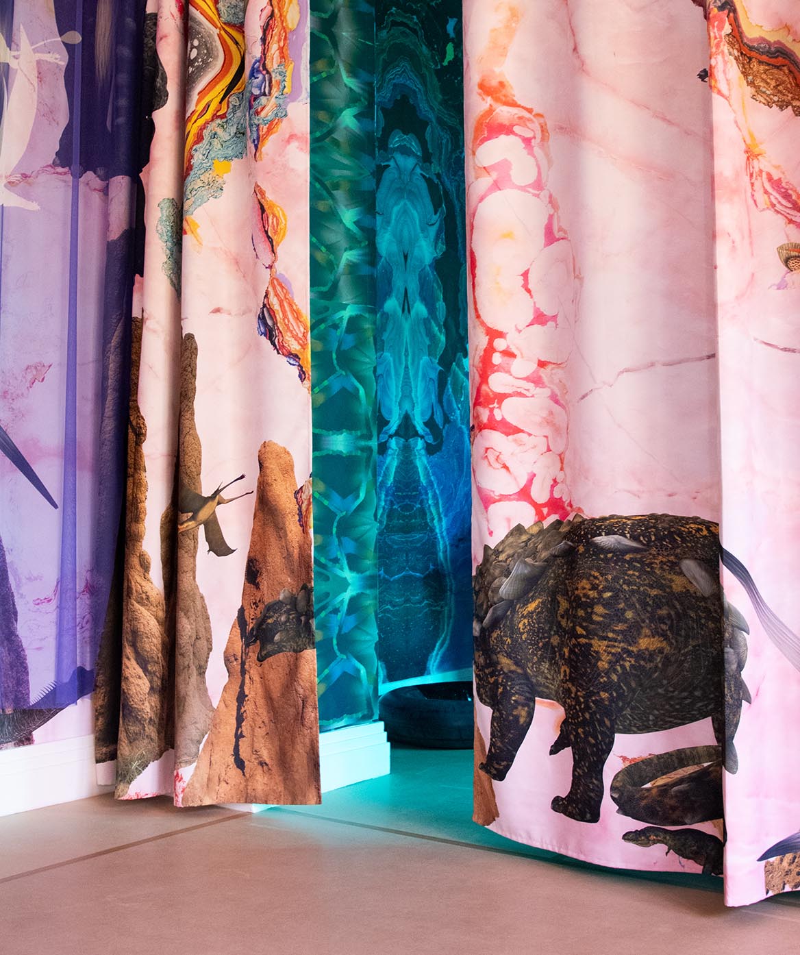 L'installation présente notreTissu groovy, imprimé recto-verso avec une clarté exceptionnelle, à côté deTulle 300Des motifs éclatants, inspirés des fossiles, animent ces créations. Ensemble, ces matériaux composent un paysage textile riche et complexe, à la fois tactile et dynamique.