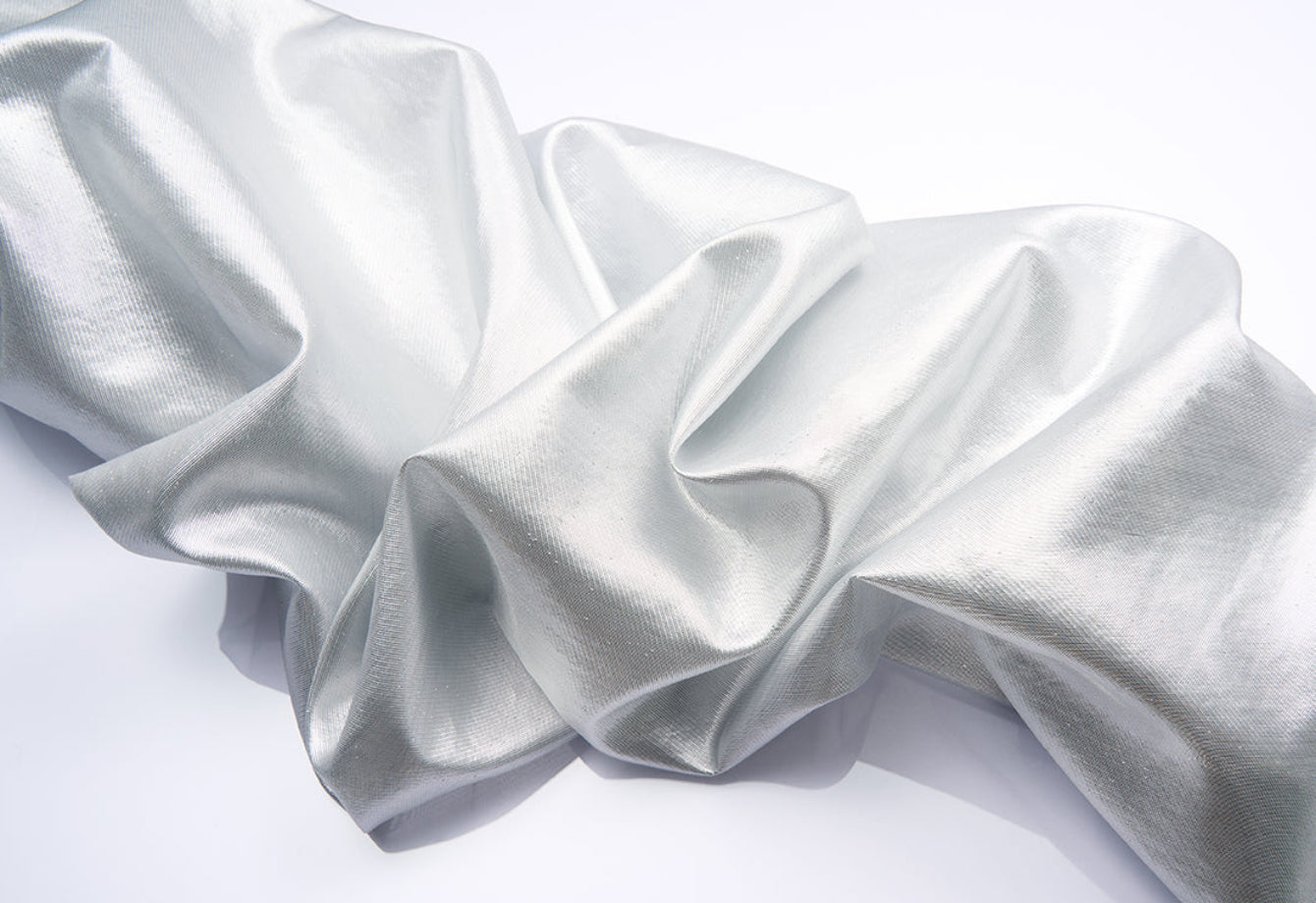 Tissé en Italie à partir de polyester recyclé haut de gamme, ce tissu léger de 43 g/m² allie un traitement spécial au film métallique à une production écoresponsable, offrant un luxe visuel et éthique.