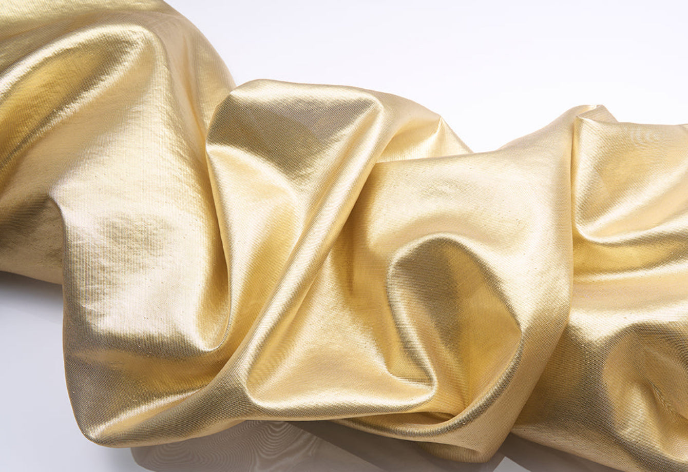 Tissé en Italie à partir de polyester recyclé de 43 g/m² traité avec une feuille métallique haute technologie, ce tissu allie durabilité et tactilité délicate, incarnant un luxe responsable grâce à une matérialité innovante.