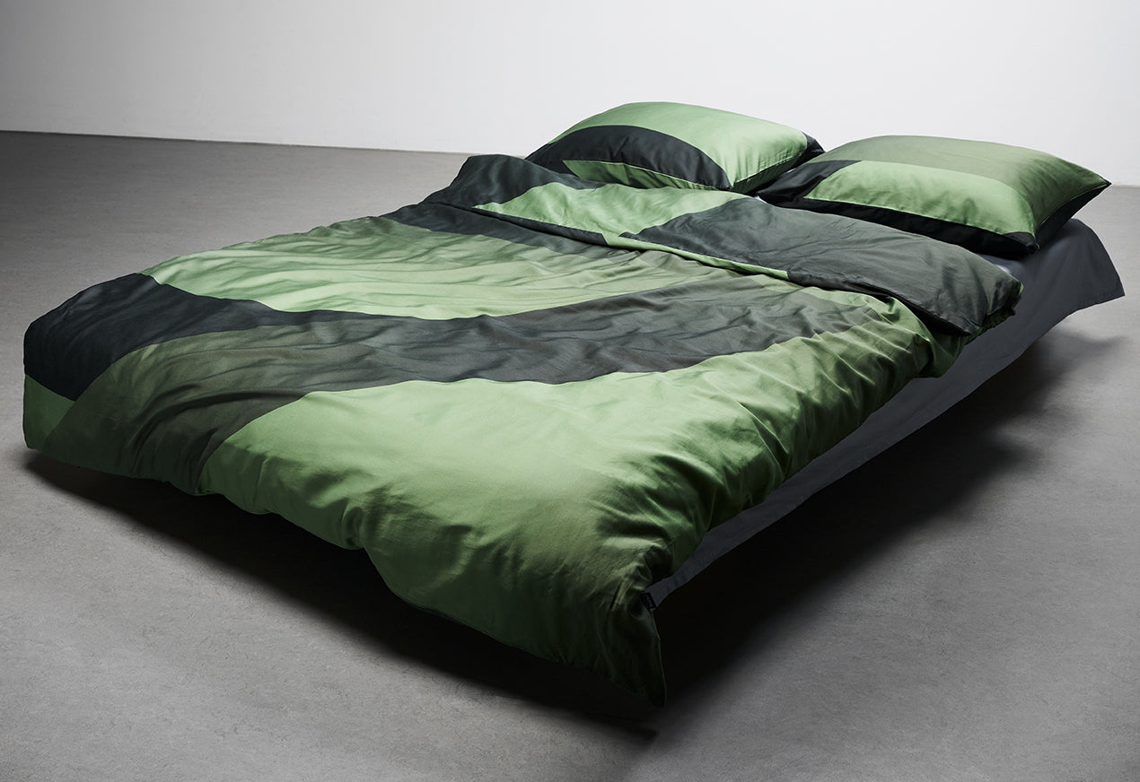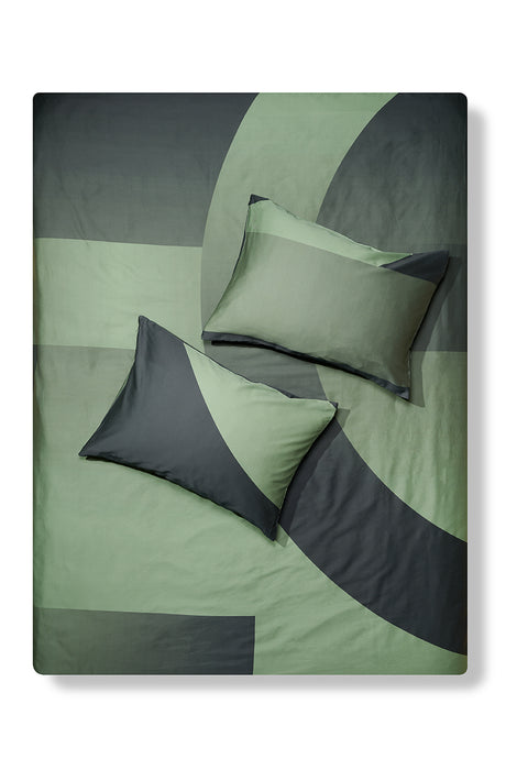 JOIN OUR TALENTED ARTISTSThe “Bedtime Tangents Nightly Green” bedding by Dario Cortese contrasts bold geometry with dark gradients of green, evoking calm, mystery, and intensity.