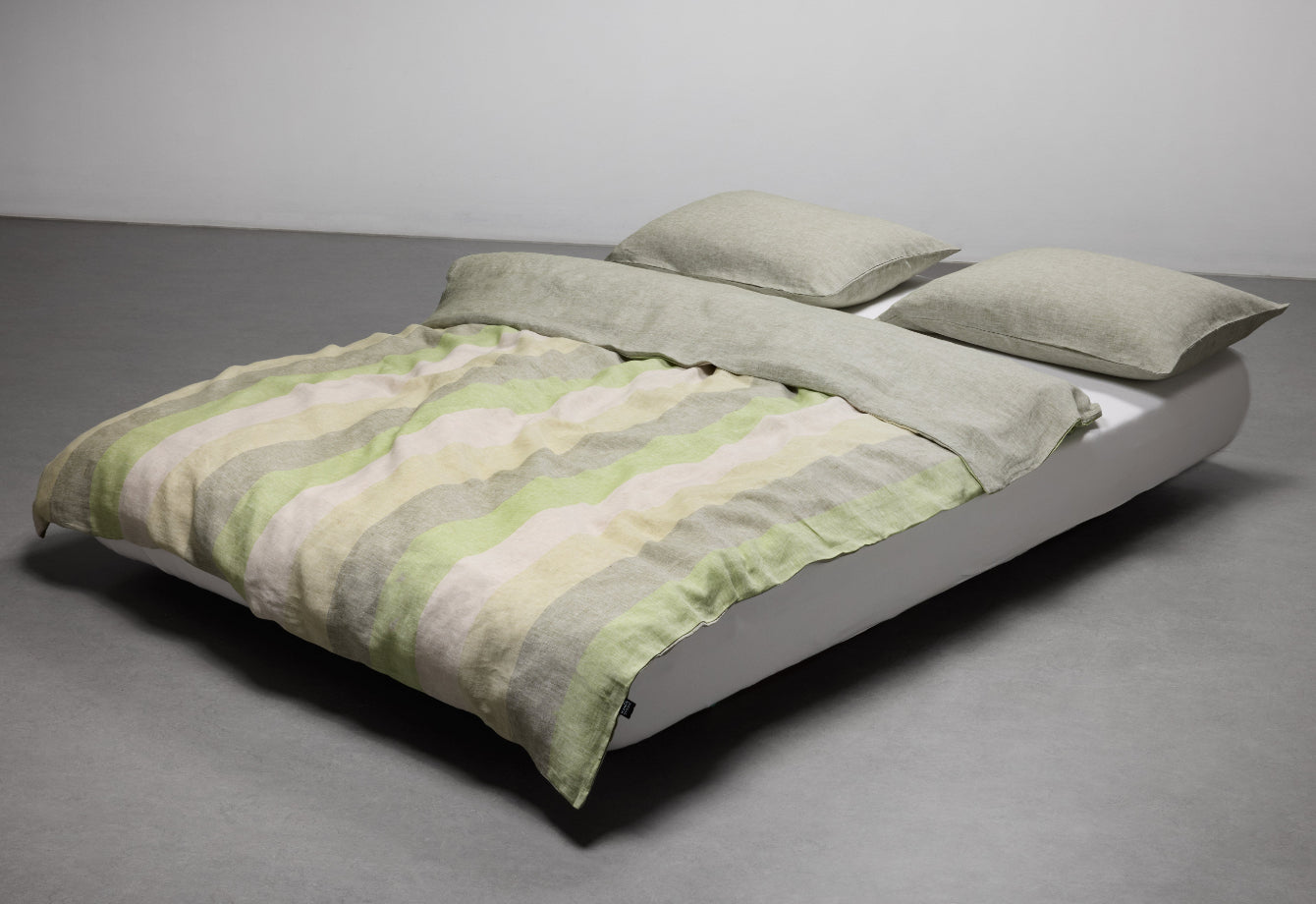 The Riviera Striped Green bedding is a nod to the serene vibrancy of Mediterranean landscapes. Featuring four oversized stripes in harmonious green shades, it flips to a matching melange linen for dual styling. Woven with care in Italy from yarn-dyed flax fibers, this collection merges design elegance with artisanal quality. Lightweight yet durable, it's ideal for both warm and cool nights—pure luxury with coastal charm.