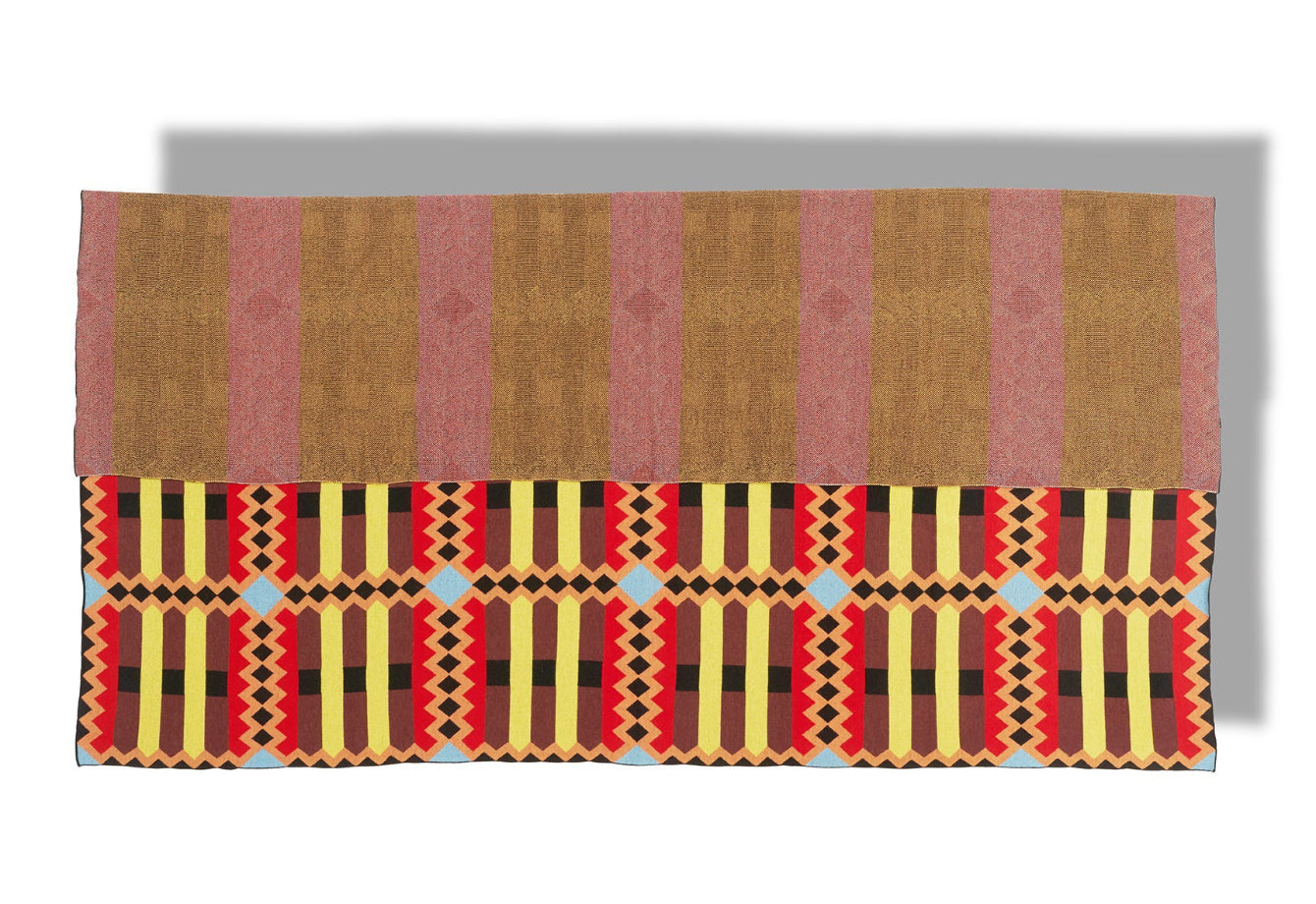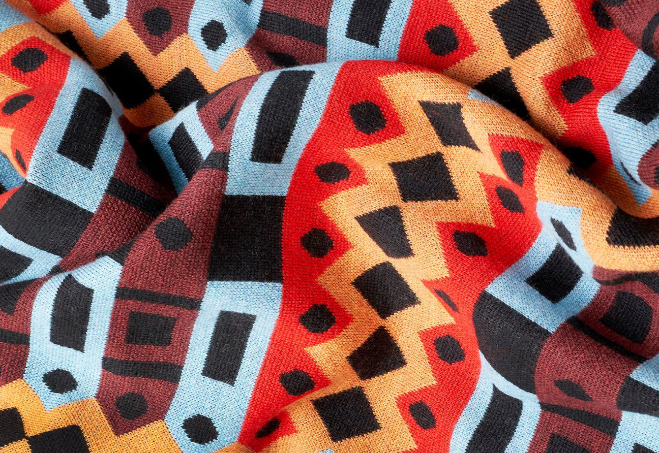 Rows of fire-red, saffron and cocoa bars lock together with saw-tooth edges, each unit separated by a glimmer of sky-blue like bunting between market stalls. Ultra-fine Italian merino wool knitting turns the 180 × 200 cm throw into a weightless veil of colour that doubles as bedspread, sofa accent or oversized poncho—limited edition vibrancy you can wear or display.