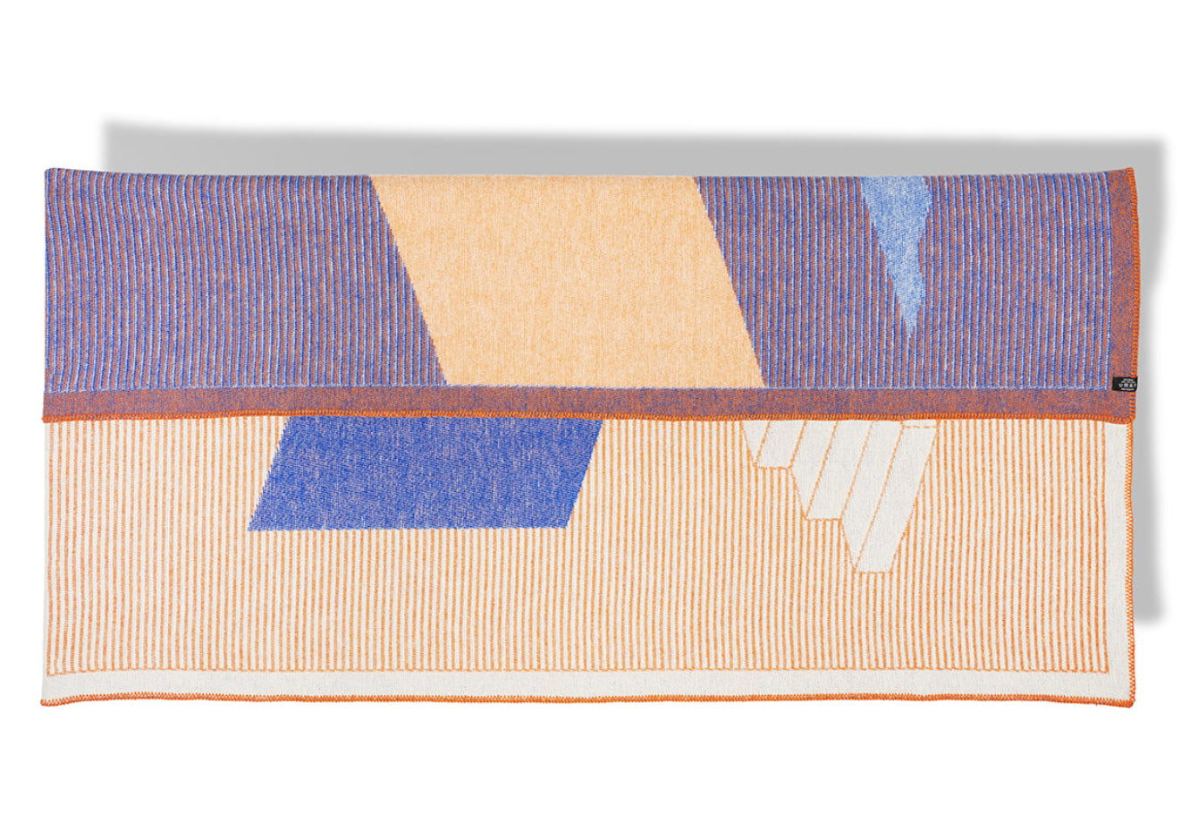 While in the Swiss Alps the artist watched evening shadow turn stone walls violet and sand orange. In this blanket she strips the scene to three elements: stair, arch, horizon. Threads of two colours interlock to create a moiré effect that suggests shifting light long after the loom has stopped